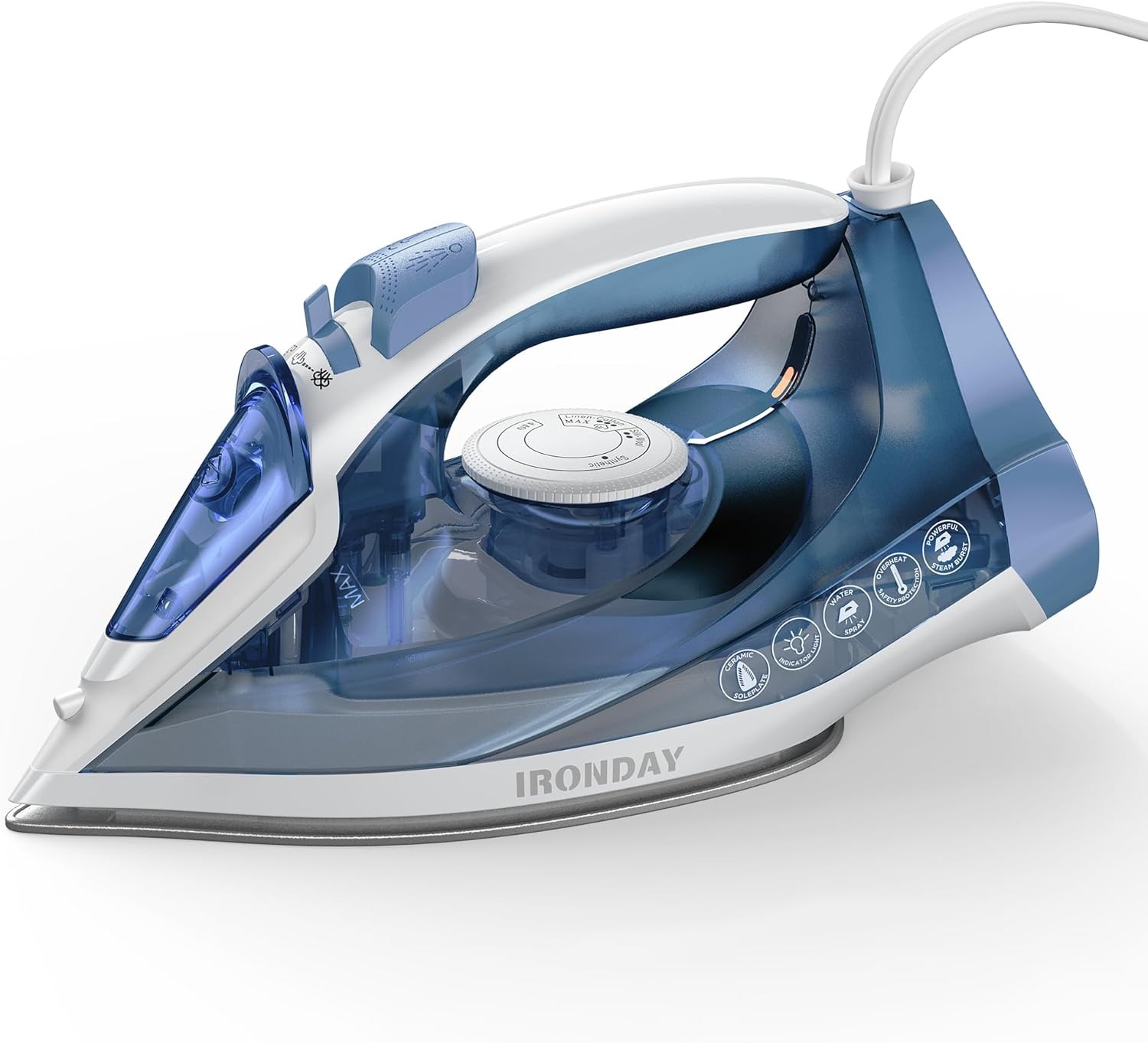 Durable stainless steel soleplate glides smoothly over fabrics and resists wear and scratches for long-lasting performance. 8-foot retractable cord provides ample reach and neatly tucks into the iron for easy storage. Heats up in less than a minute for fast, even heat distribution on all types of fabrics. Offers versatile steam options with water spray, steam blast, and vertical steam functions for both flat surfaces and hanging garments. Full steam control allows you to adjust the steam level to effectively remove stubborn wrinkles or dry-iron delicate fabrics. Features a large temperature dial with clear indicators for easy fabric selection and optimal heat settings. Equipped with a top-mounted water tank and easy-view water window for simple filling and monitoring. The presence of water droplets or condensation in the steam chamber during quality testing may confuse some users, despite being harmless.